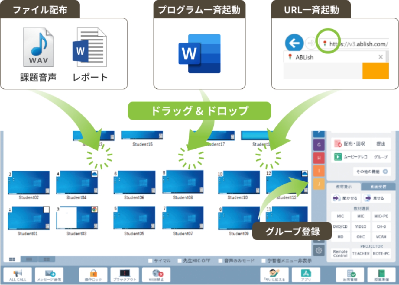 We have developed a system with outstanding operability and functionality, enabling the teacher to distribute teaching materials by drag and drop to learners, speak to all of them simultaneously with a single click and, when necessary, give an individual instruction by simply clicking on the learner’s icon.