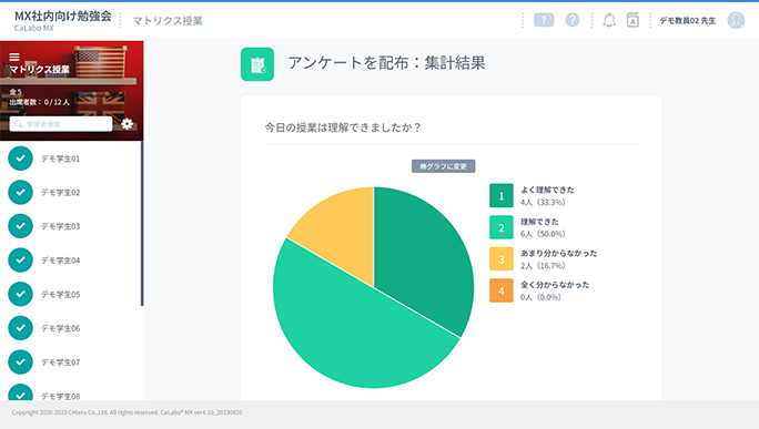 - The aggregated results of the survey are shown in pie charts and bar graphs and saved on the cloud. The results can be referred to at any time.