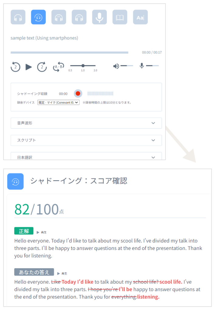 - When shadowing, the recorded audio is converted to text and automatically marked against the textbook text. For dictation, the transcribed text is automatically marked against the textbook text.