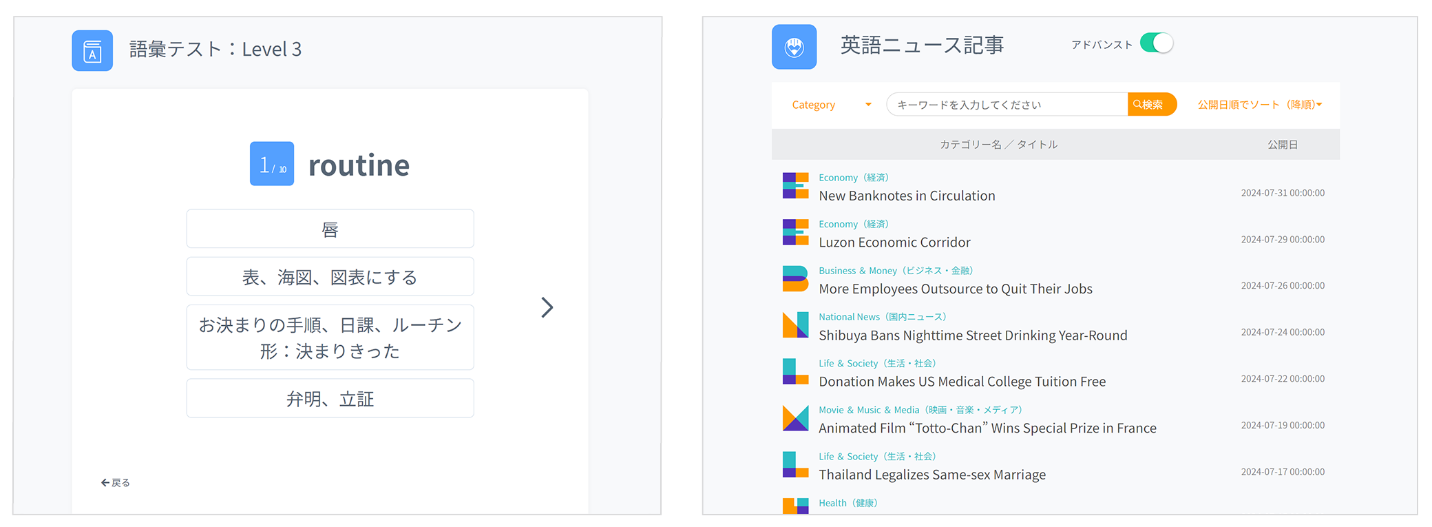 - Updated three times a week, you can choose the difficulty level from two levels: "Advanced" or "Basic." It also comes with audio of the articles and a quiz to check comprehension.