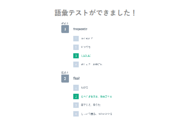 In addition to audio and text materials that can be used for language activities, users can also easily create English word tests as teaching materials. Simply specify the English words you want to set as questions, and the choices will be set automatically, allowing you to conduct a quiz right away.
