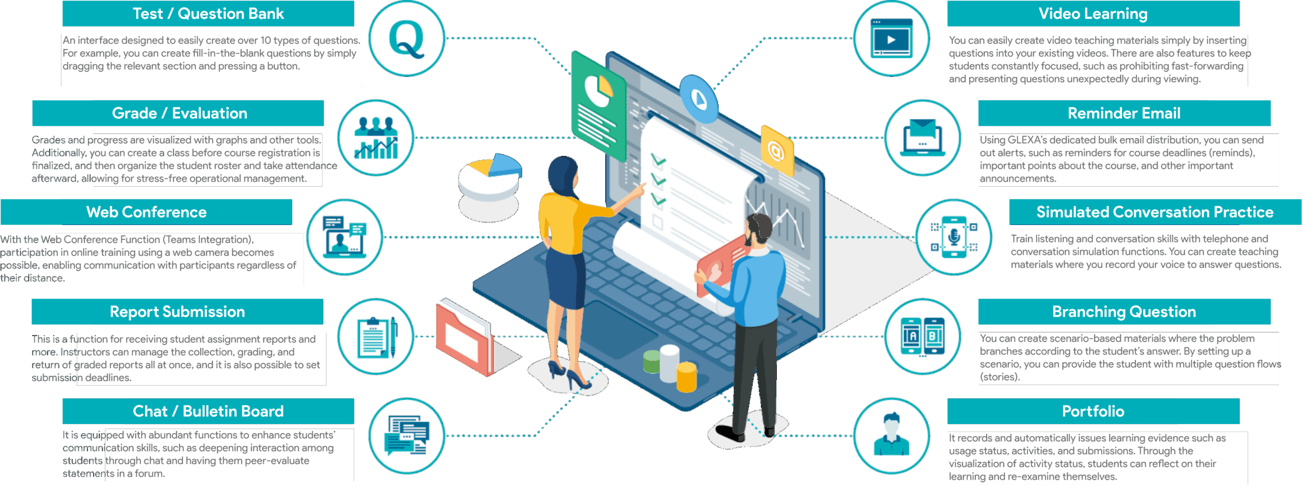GLEXA provides everything from lectures and tests to assessments.GLEXA is a learning system that combines powerful e-learning features—leveraging video and audio for effective learning—with a portfolio function that supports rubric-based assessment.